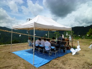 梅雨の合間に、阿南町のM邸の地鎮祭が行われました。かえって陽射しが暑いくらいでテントが無ければ、ちょっとエラかったかも?です。特におじいさんとおばあさんまで、3世代どころか子供さんまででは4世代という、めったにお目にかかれないおめでたい地鎮祭でしたので日除けは必需品です。敷地の上の段には、おじいさんたちとお父さんたちのそれぞれの新しいお家があり、この敷地は新たに造成された眺めと日当たりのよいロケーションです。私は下伊那では通った道が無いくらいですが、この道は初めて通りました。いいお家になりそうです。