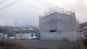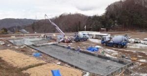 今日は日曜日でしたが、阿南町の富草老人支援ハウスの基礎コンクリート打設が行われました。普通休日は、生コン会社が休みなのでコンクリートは出荷されませんが、年末はどこも追い込みで、なんとか年内に打って正月休みをコンクリートの硬化のための養生期間に当てたいので、またそうすれば自分たちも気楽に正月休みがとれるので、どこの現場でも年末ギリギリまでコンクリート打ちが行われます。とは言っても少しばかりでは生コン屋さんも動いてくれませんが、ここでは100㎥程あるので特別でした。桜井課長が、昨日のうちに雪が積もらないように全面をシートで覆い養生をしてくれてあったので、大正解でした。さすがの段取りです。