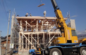 松尾のM邸が上棟できました。本来は明日の予定だったのですが、天気が悪そうなため塩沢君が前倒ししてくれました。大工さんは福与棟梁以下息のあった7名で一生懸命やってくれましたが、床面積が50坪くらいあることと下屋が大きく2カ所あるので完全にはならなかったものの、下屋の野地板の仮止めまで進み雨養生もできて良かったです。天候が許せば明日、野地板を釘止めしフェルトを張って内部の造作に移れます。無事に棟上げできてなによりです。