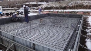 昨日は雪が舞って、と言うか、高いところでは結構積もったようです。夕方、上沼さんは松川ICでは10cmもあると帰ってきましたし、今朝も、部長が久堅から降りてくるにはツルツルで怖かったが、この辺りは無いと感心していました。毛賀のM邸の現場では、昨日鉄筋工事が完了する予定で、検査が行われるはずでした。しかし、雪が積もり始めたので塩沢さんから延期の連絡が入りました。それからしばらくすると止んだので現場に寄ってみると、いつから再開したのか鉄筋屋さんもいて作業は完成するところで、塩沢さんと原さんとで、全体をシートで覆って雪が積もらないようにする準備をしてくれていました。少しの雪はコンクリートの凝固熱で溶けるのですが、固まりを見逃すと穴になってしまいます。