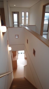 阿智のI邸の社内完成検査を休日出勤組を含めて総勢6名で行いました。外観は、切り妻屋根と落ち着いた色のタイルが相まってシンプルで好感が持てます。内部も木目調の淡い色使いでいい感じです。玄関上には小さな吹き抜けがあり、ホールやローカを明るくしてくれています。吹き抜けは、好き好きで、空間が無駄に感じたり、居間などでは冷暖房の効率が悪くなる欠点はありますが、明るさや解放感はそれらを上回ることも多いです。ここは、2階のローカに余裕があり、バルコニーへのドアもあるので、暗くなりがちな2階が本当に明るく、通風も良くできています。