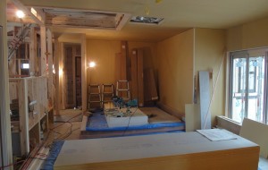 豊丘N邸の外壁防水下地検査を行いました。昨日は雨が強く、下屋とか庇とか良く見なければいけない納まりが何箇所かあるので延期しました。今度の遮熱防水シートは防水テープとの着きが良くなく窓回りなど浮いている所があるので、外壁を張る前によく押さえる必要がありますが、通気胴縁でしっかり押さえられているので漏水の問題はないことを確認しました。内部の途中経過も見ました。広くてリッチな計画の空間が現れてきました。LDKの正面に半分高屋根のたぶん?デッキは、その両袖の部屋に短い動線でつながるハーフコートになっていて、しかも、居間の畳は小上がりで、奥の階段前が吹き抜けのスキップフロアーで3次元に広がります。収納も便利で豊富です。美しくなりそうです。