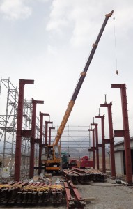 豊丘の伴野工業団地内M社の事務所棟の建て方をしました。天気が定まりませんでしたが、鉄骨の場合は雨降りでは作業は危険になるものの高所作業車で行うことができるし、鉄が濡れても性能には影響しないので予定通りに建てられました。この現場の真上よりは少しずれてはいるのですが高圧線があり、クレーンが近づくと危ないので、朝から中電とシーテックの社員さんが監視に来てくれていて、その人によれば、地上から電線まで夏で22mくらいで、4m以内に近付けてはいけないとのこと、屋根の2倍くらいの高さですから案外近いので危ない感じがしました。この電線、今はアルミだそうですが、夏たくさん電気を使うと熱を持つので、余計に伸びるのだそうです。冬とでは2mも高さが下がるとか、驚きです。実際、電線の下で長い竿を使うときは気持ちは悪いです。