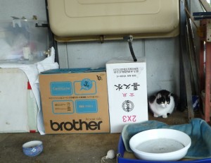 ブチが子を産みました。と言うか、知らないうちに産んでいました。今朝、ラジオ体操をしていると、ブチが発砲スチロールの中に入ったままなので、ヨシコさんが様子が変だと中を覗き込んでいましたが、どうも子がおるようだと、嬉しいんだか、困ったのかどちらにも聞こえる声を出していました。と言うのも、ブチは去年生まれた雌で、同じころ生まれたチビは雄で、いつも仲良くジャレているので、そろそろ危ない季節だとチビの玉を昨日中山先生に取って(実際には取らないと思うが)もらったばかりだったのです。今朝も、私が出社すると、いつものように玄関先でシロと待っていて、車を先導してくれたので、まさか出産していたとは思いませんでした。ブチはもともと太い猫で、餌も他の猫一倍食べるので、ヨシコさんは疑っていましたが、驚きです。しかも、箱に手を入れて触ったら結構大きいのです。子猫は一匹だけですが1週間くらい経つのではないでしょうか?天竜川というわけにもいかないし、誰かもらってくれませんかねー。お願いします。