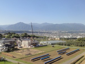 今日は良い天気でした。朝は肌寒く今秋初めて長袖を着ましたが、昼間は埃っぽい道路ではエアコンを入れました。下久堅は竜東なので、丘の上からするとまるで田舎のイメージはあるかもしれませんが、家も多く、天竜川に近い県道沿いばかりでなく、少し上の段にも人家は多いのです。ここは、小学校や支所、診療所、JAなどが集まる中心地で、大三国花火で有名なお祭りは賑やかで盛大なものです。H邸は玄関と西側に下屋があり、建て方作業は夕方までかかりましたが無事終了できました。日が短くなりました。