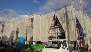 白山町のS邸とH邸はお隣同士で、工事も同じくらいの段階で進んでいます。今日は両方の外壁下地の防水検査を行いました。H邸の玄関上の後施工の水切りの取り付け部を除いては防水は完璧でした。これなら今、雨が降り込んでも壁の中に水が入る心配は大丈夫ですが、大きな台風が直撃しそうなので、この週末は塩沢さんは台風対策に忙しいのです。被害がなければよいのですが・・・。