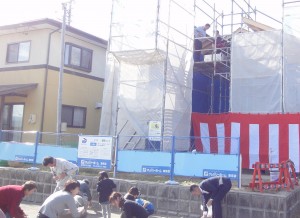 毛賀のM邸の上棟式が行われました。この頃では珍しくなった上棟式ですが、お施主様のM様には新築には餅投げがつき物という思いがあり奮発していただきました。その投げる餅もお知り合い九州?の方に依頼されたとのことで丸いお餅でした。しかしこれが少しボリュームがあるので、上から投げると子供さんもいるし当たれば痛いのではと心配しましたが、拾う皆さんは夢中なので気にしていられない様子でした。久しぶりの餅投げのある上棟式ができて、拾う人も投げる人も楽しく出来て良かったです。追、上棟式の祝詞奏上も練習の成果が出て我ながらまずまずにできました。少し進歩。