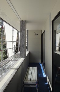 N邸のバルコニーの防水の様子です。ここはインナーバルコニーになっているのでヤッパリいいんなー?って調子で、洗濯物が風雨には晒されにくいです。また、家の中ではこのバルコニーも漏水の危険が大きいところなのですがその点でも引っ込んでいれば有利です。特に手摺上端の壁際が危ないので、笠木を付ける前に防水を完璧にしておかなければいけません。さらに、バルコニーの床下や壁の中も湿気っぽいところなので、手摺壁の中も外壁と同じように通気ができる方がベターです。それで手摺上端の両サイドには通気ができる部材がついているのです。よく見えませんが・・・。