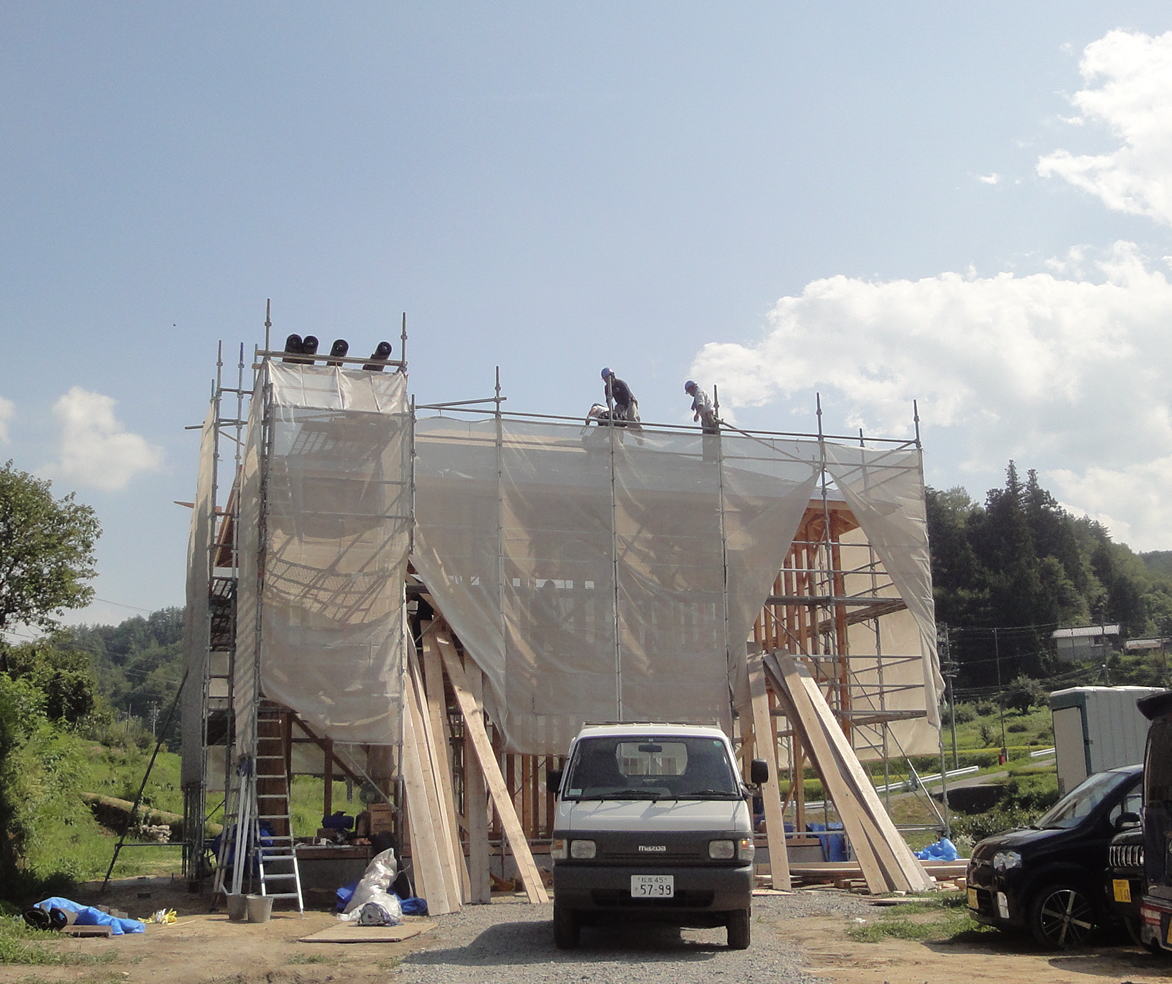 N邸 今日は、8月最後の大安で、予定通り龍江N邸の建て方が行われました。この頃は、すっかり秋らしい風が吹くようになったとは言うものの晴れれば温度も上がり、まだまだ熱中症の危険はあります。今日は、古瀬水棟梁はじめ7人で建ててもらいました。屋根がシンプルな寄せ棟ということもあり、2時過ぎにはフェルトを貼るところまで進んでいました。少し離れた所にN様の実家が望めます。無事に上棟できてなによりでした。