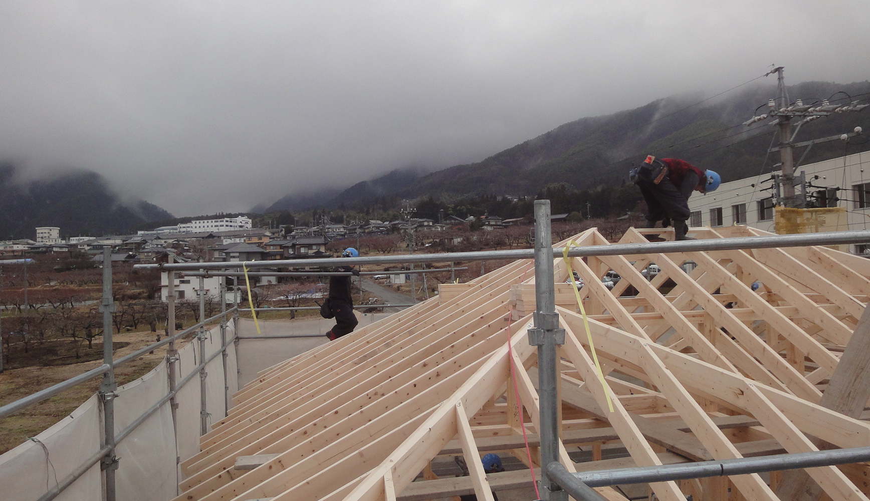 今年最後の建て方が羽場赤坂O邸で行なわれました。昨日からハッキリしない天気でしたが、昨日はなんとか一日持ちまして年末の追い込みが各現場で助けられました。そして夜は、かなりの雨音がしていまして、帰りがけの気温が4℃だったので雪にならないように願っていたのです。なにしろO邸は少し高く松川沿いに雪が先に降りてくるところで、先日ウチでは舞っただけだったのに基礎屋さんが現場から帰るのに雪で滑って怖かったと嘆いていたくらいです。一転、今朝は凍みが無く、大工さん達は上着を脱いで作業してくれていました。午後から風が強くなりましたがなんとか無事に3時に終了でした。まだ現場は動きますが、今年も無事に終われそうです。