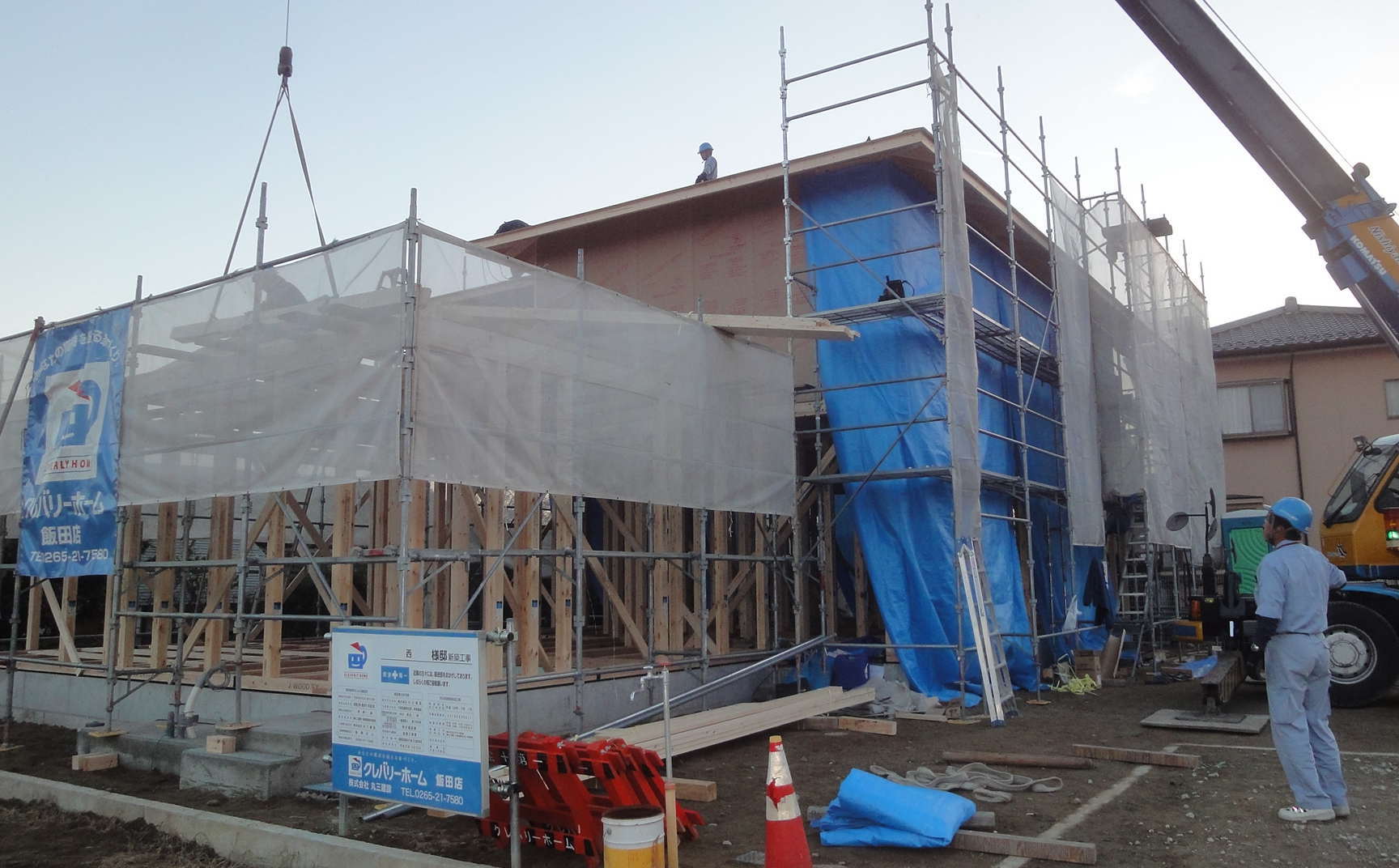 松尾のN邸が無事上棟できました。とは言っても、60坪以上あるので下屋の屋根がまとまっていませんが、それでも一日でここまでくれば上出来です。私は、二日がかりとは言うものの、大屋根の垂木さえある程度形になればシート養生ができるので、もし雨に降られてもなんとか濡らさずに済むかなと期待していました。しかし、そこはさすが塩沢さん!大工さんを10人入れてくれたのでフェルトまで貼れました。ウチの大工さん達は、どんな組み合わせでも息はピッタリですので、熊谷棟梁も予想以上の進みに喜んでいました。明日も屋根には霜が降りるので、残った作業も気を抜かないようにお願いしますね。ありがとうございました。