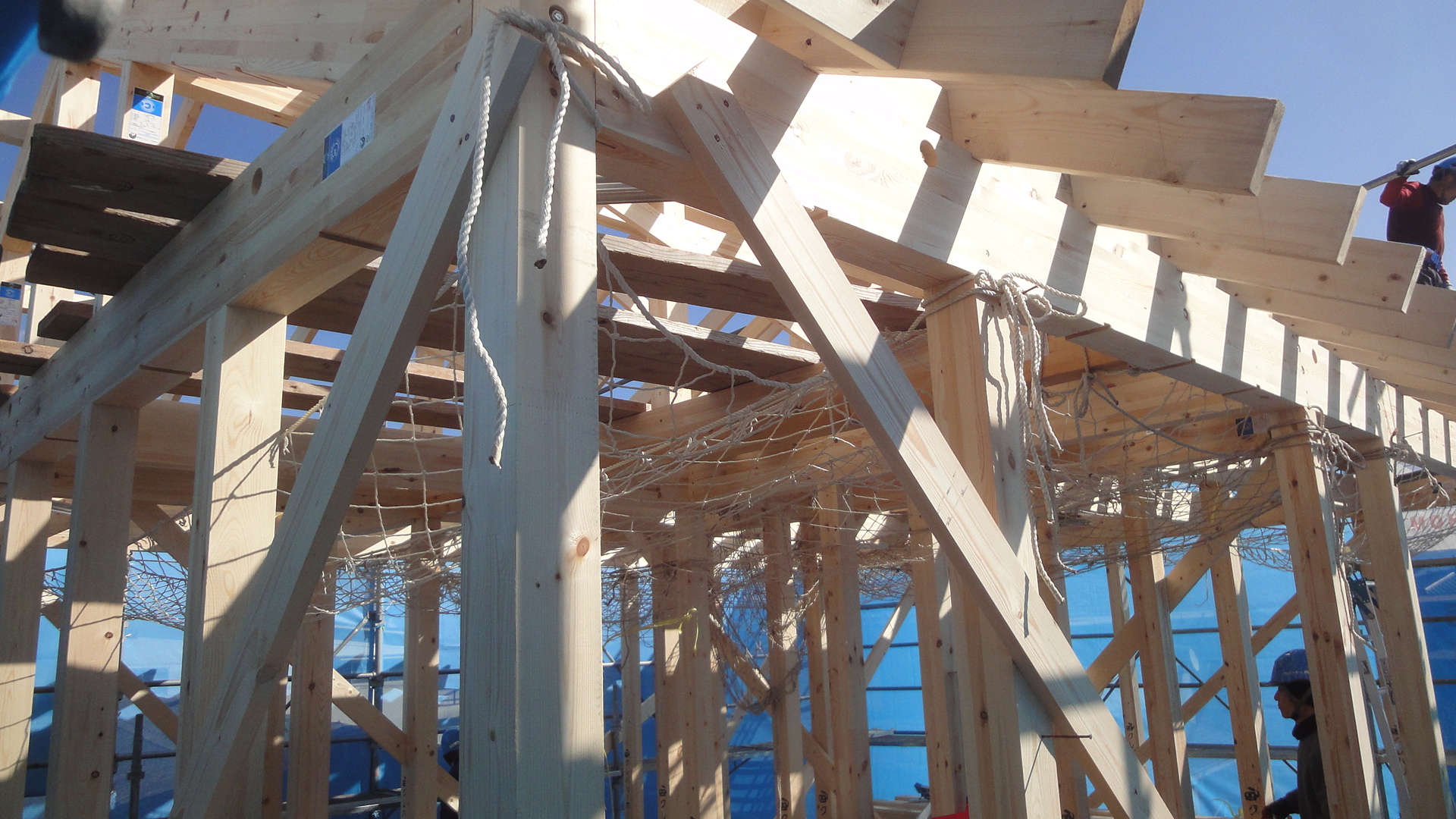 今年初めての建て方が無事に終わりました。市内白山通りのH邸は、実は昨日の大安が予定日でした。朝は悪くはなかったのですが、天気予報では昼ごろから完全に雨だったので塩沢さんは朝一に延期メールを入れてくれました。それで今朝はこの時期にしては5℃以上ありましたが、予報通り風が強く、クレーン作業では風が大敵なので心配されました。幸い現場は天竜川沿いのセンター付近ほどではなく建て方には支障はまったくないようでした。建て方時は墜落の危険が一番大きいので今年からは安全対策を強化していますが、更に安全作業ができるように改善して行きます。