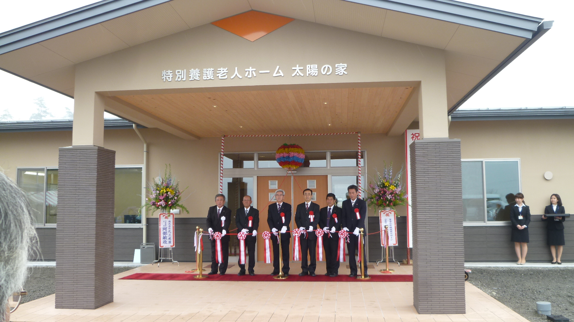 阿南町の小規模特別養護老人ホーム「太陽の家」の竣工式が隣の富草診療所と合同で行なわれました。先日の検査の折より外部もまとめてくれてあり、曲がりなりにもここまで無事にたどり着けたことは、所澤さんはじめ現場員さんの苦労の賜物です。まだ残工事はありますが、本当にご苦労様でした。この仕事は特別難儀をしました。職人さん不足で工期は大幅に遅れてしまうし、追い込みの最中には作業中の塗装屋さんが具合悪くなって救急車で運ばれて心配されましたし、更には記録的な大雪が重なり工事が立往生してしまうしと、試練の連続でした。それでも、専務や三石部長、桜井部長が応援してくれたおかげもあり現場のみんなも頑張れて今日の日を迎えることができました。本当にたくさんの皆さんにお世話になりました。わたしもくす玉割りをさせていただき、感謝状の謝辞を言