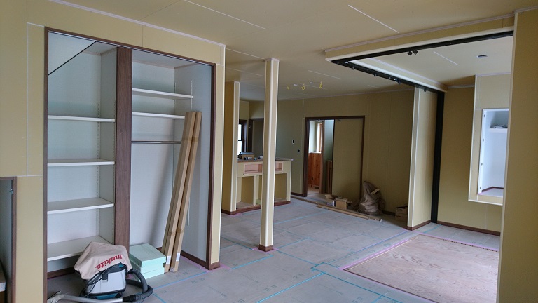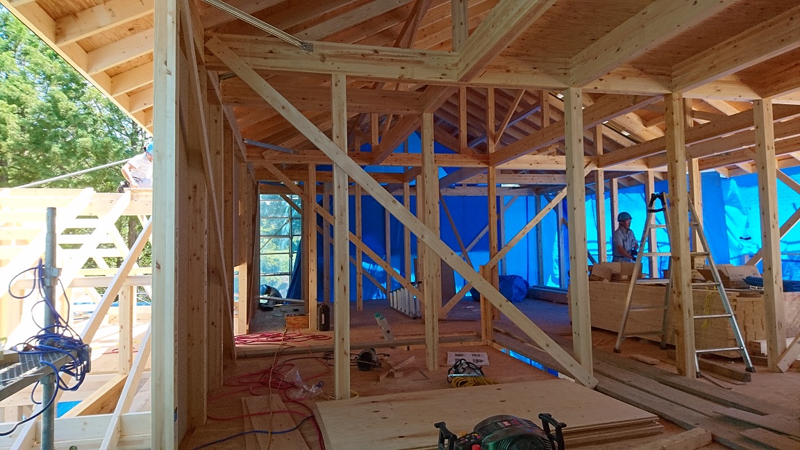 泰阜村M邸が無事上棟できました。昨日が大安で、ほとんどが野地板まで張れたのですが、小屋裏や下屋があるので本日に持ち越しました。前日まで天気が悪かったので、建てるまでには基礎内部にたまった水を石原さんと塩沢さんが汲みだすのに2日かかりました。それでも建てる日にちゃんと晴れる幸運に恵まれラッキーでした。
