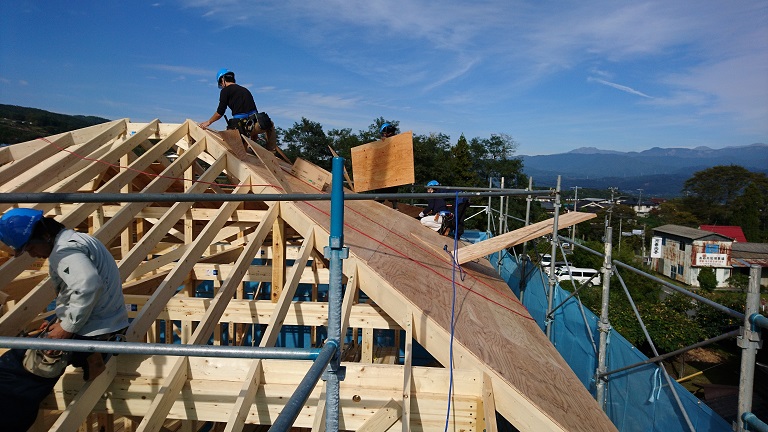 高森町牛牧のK邸が無事上棟できました。前日までは風が強く心配されましたが、おかげさまで当日は秋晴れのさわやかな建舞日和でした。ここの場所は上県道沿いの本宅の西側で、私はてっきり上市田地籍と思っていたら牛牧が山側から回り込んでいるのでした。このお家の棟梁は、親父さんが建てられた本宅の棟梁と同じ大工さんです。基礎の折も、未だに全く狂いがないとお褒めをいただけて、それで若いご夫婦に当社を推薦してくれたと聞かせてくれました。2世代で仕事をさせていただけるとは本当に