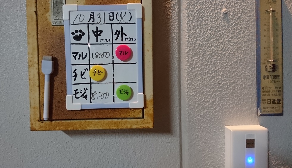 出勤簿 これ、社員出入り口の壁にこの頃掛かった出勤簿です。本社には、当たり前のようにこれらが出入りしてコピー機の上や、いつも会社にいる人たちの机の上などでくつろいでいます。それはそれで衛生上問題になることもない仕事だし、いやされる効果もあるのでいいのですが、夜になっても残されていることがあり、間違うと朝までにそそうをしたりすることもあります。また警報がなっても困るので保護者が出勤簿を作ってくれたようです。会社にはタイムカードもありませんが、これはよく考えましたね。特許ものです。