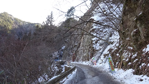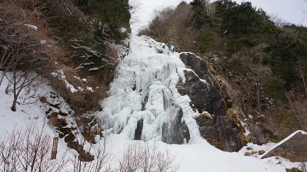 今日は雨になると言うので、氷が融けないうちに高森町の不動滝を見に行ってきました。冬の不動滝は確か3回目なんですが、前回は滝に近いの橋のところでジムニーでさえ登れなくなりすこし歩きましたので、そのあたりまでは行けるだろうと軽い気持ちで出かけました。ところが、浄水場を過ぎた堰堤の上で早くも通行止めになっていて、車が7、8台駐車していました。それでも30分くらいで着くだろうと歩きだすと、思ったより坂が急で、除雪がしてある雪道を一歩一歩まるでスノートレッキングで、厚めの防寒対策が災いして