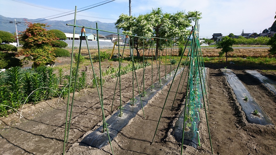 残念なのはプルーンです。やっぱり霜にやられたようで小指の頭ほどの実が付いているのですが少ないです。またお母さん(妻)の野菜畑のキュウリやトマトの支えのお手伝いもしました。まだやらなければいけないことは残っていますが自家製野菜が食べられるのはありがたいです。