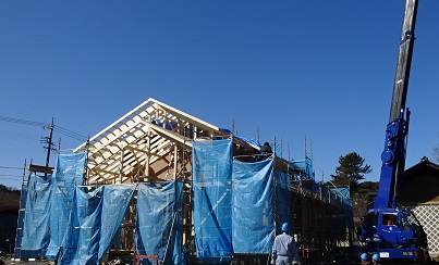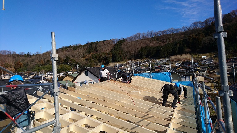快晴 昨日とは打って変わった良い天気に、喬木村伊久間M邸で今年初めての建て方ができました。日が良くて天気も良ければ気分も最高です。社内大工のTさんが屋根の垂木を丁寧に止めてくれていてだいぶ型になってきましたね。やはり建て方の時が一番危険が大きいので、今年も安全第一で作業していきたいと思います。