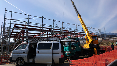 本社 桐林N工業様の本社が無事に上棟できました。N様は建築の仮設工事の仕事をされていて、車や資材の置き場としてもけっこう広い敷地が必要です。それで今までも盛り土はされていたところの土地を擁壁で造成して広げ立派な社屋を建てられます。外人の研修生?も何人かいるようなので事務所も要るんだと思います。屋根が載るまで雪が降りませんように。