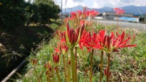 10月 もう10月になり、さすがに朝晩冷え込むようになり羽織る物が欲しい時があります。家の裏の道路の土手にも彼岸花が遅ればせながら咲き始めました。毎年そうなのですが、土手の草が伸びるので彼岸花の事を考えずに草刈りをしてしまうんです。たぶんその中に花をつけるための茎が伸びていると思うのですが、彼岸花は初めにその茎だけが伸びるので、草の中では気が付かないんです。それを刈られてしまうので家のところは遅くなるんですね。それでも毎年咲いてくれて生き残ってくれています。