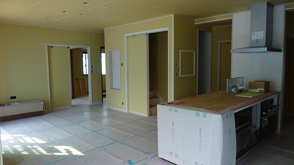 下殿岡O邸の木工事検査を行いました。パッと見で、大工さんの仕事はきれいにできているので指摘事項を探すのに力が入りません。ただ階段回りで1か所だけ改善の余地ありました。しかし余裕のある、と言うより、若いご夫婦のご家族にはすばらしいお家になりそうですね。このお家も、ホントよく考えられているのです。特に1階は、玄関から直ぐに独立した和室に入ることができます。掘りごたつもあるこだわりです。収納も便利に作られていて、LDKはとても広く明るいので大らかな暮らしができそうです。コスパ高いと思います。