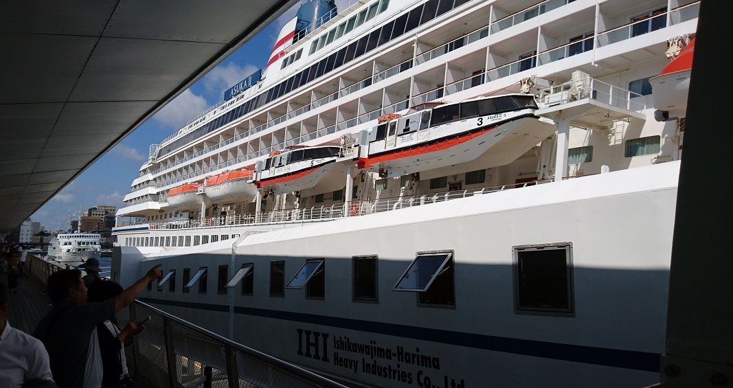 豊丘村経営者協議会の旅行で、横浜から神戸まで飛鳥Ⅱでワンナイトクルーズをしてきました。以前から飛鳥にはあこがれていて、世界一周とかは無理にしても乗ってみたいと思っていました。朝10時に出港して翌朝の10時に着岸するのは、一泊旅行としては飯田からは初日がきついのですが、お試しの乗船にはぴったりです。アルコールや特別高価な食事を除いて船内の飲食は含まれていて、午後のハンバーガーやデザート、夜食などもあり長く乗ったら太ります。船内では有料Wifiが使えるのですが、陸から遠く離れると携帯が使えないので、やっぱり豪華客船のお客さんはリタイヤした人が多いのは納得でした
