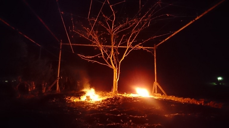 霜 なんかおかしな天気が続いて寒いです。先日の日曜日も、前日に霜への注意を広報で流していました。それで、花が咲いていたり、まだ咲き終わったばかりのプルーンが昨年のように凍害でやられないように3時に起きて対策の燃料(結構高い)を燃やしました。本当はシートをかければ一番いいのですが、風が少しあったので早起きすることにしたのです。でも3時にはもう霜が降りていました。夜明けが早い今は2時でなければ間に合いませんね。