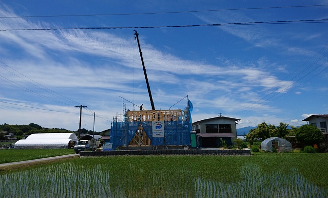 田舎 今週初め、豊丘村河野でK邸の上棟ができました。なんとなく懐かしい田舎の風景になっていますが、住まい方が田舎暮らしの一つの方法を示しています。と言うのも、ここのお家の高齢の夫妻には跡取りが無く、少し離れたところに住む姪御さんが敷地内にお家を建てるのです。敷地内ですから、もしものことがあれば安心ですからね。