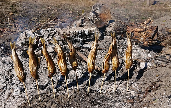 鮎飯 畑の木を剪定した枝を燃やしたのですが、いい熾きができたので冷蔵庫に凍らせてあった鮎を焼いてみることにしました。金串を探したのですが無かったので、ちゃっとコメリで竹串を買ってきて土に差してあぶり焼きにしました。一番簡単な炭火焼きの方法を発見しました。ここまでできれば初めての鮎飯に挑戦です。家族にも好評のなかなかの美味でした。