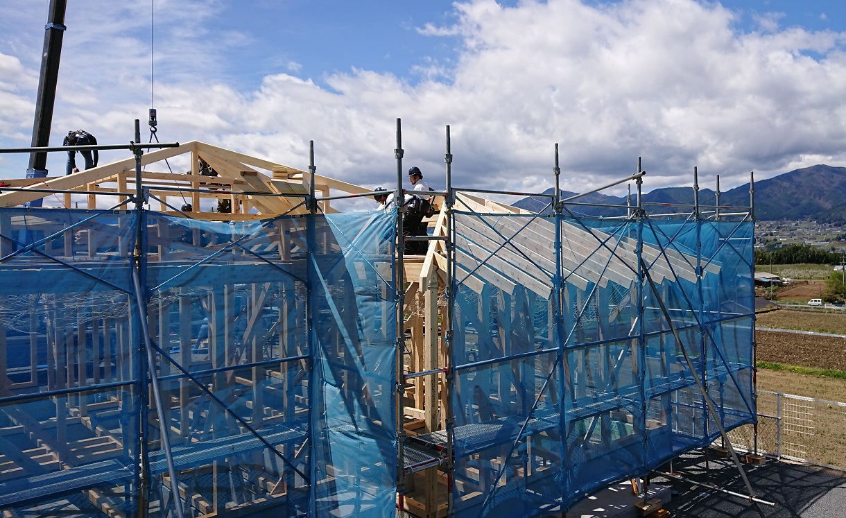 強風 豊丘村でS邸の建て方が無事に完了しました。このお家は昨年火事にあってしまい、今年になって建てればよい運勢になるということでようやく上棟の運びとなりました。平屋なのですが、風が強く難儀をしました。特に風を受ける屋根の合板の作業が危ないです。突風で人まで飛ばされそうな勢いがありました。大工さん達は何時も安全第一で作業してくれて有難いです。ありがとうございました。