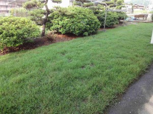 ここのところの梅雨のおかげで、去年の9月末に貼った本社の芝が伸びてきました。植えたときの目的は、元々の芝よりも雑草の勢いが強くなり、どうにも手がつけられなくなったので、新たな芝を繁茂させて雑草退治の手間を省くことだったのでした。ここまで来ると、その目的はある程度達成できたように思えるのですが、ほとんど週一の雑草取り(梅雨時は週二の時も)をしないと、またまた雑草畑になりかねます。特にクローバーのような根を張るものは要注意なんですが、その甲斐あって大分芝生らしくはなってきて、そろそろ刈り込んでアプローチの練習でもできるかなと密かに期待しているところです。しかしこれからも私の雑草取りは続くことになりそうです。