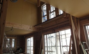 座光寺のK邸の外壁下地防水検査をしました。ちょうど本部のスーパーバイザーさんが来てくれていたので一緒に視てくれました。ここは、屋根が切り妻と片流れの組み合わせで、難しくはないのですが壁と屋根との接点や、ベランダなど防水仕上げが3か所もあるので端部などが要注意です。この辺は熊谷棟梁が良く納めてくれたありましたが、電気の配線がどうしてか1か所少し上向きに出ていて補修をお願いしておきました。内をのぞくと、このお家も大胆な空間ができてきました。平面計画もよく考えられていますね。完成が楽しみです。