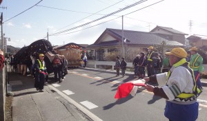 お祭りのお囃子屋台の大太鼓役でデビューしました。土曜日は宵祭りで、3時過ぎから屋台が地域内の中心の県道を往復しましたが、その時は出してもらえずに屋台の前で舵取りをしていました。しかし、これがなかなかの重労働です。子供達が引っ張る屋台は前輪の前にキャスターが付いていて、それで舵が取れようになっているのですが、道路が端に向かい傾斜がついているため、低い方に寄っていってしまうからです。そんなことで初日は終わり、日曜日は同じ道の倍くらいの長さの往復で、始めは土曜日と同じ年輩の方が悦に入っていたので出番はなかったのですが、半分くらいで「やってみろ」と言われ、まあーなんとかなるら?と太鼓をたたきました。屋台の中には調子を合わせるCDが流れているのですが音が小さく、笛の音でかき消されて2重になってしまい、うまく調子が合いません。初舞台でしたのでなかなか上手くいきませんでしたが、次回からは、また練習をすればほぼ完璧になります。今度のお祭りは、若い人が結構でていたし、屋台を引く子供達も大勢で、なんか頼もしく思いました。