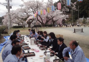月曜日の昼にお花見をしました。場所は座光寺の麻績神社の境内で、樹齢400年の舞台桜が有名なので他県ナンバーの見物客も多い中でお弁当をいただきました。お花見は、たいてい花よりダンゴというわけで、センターで焼き肉というパターンが多いのですが、みんなの都合が合わないので(この日も来れない人が3名)、幹事さんが5年ほど前にテレビに映った時のように昼に企画してくれました。豪華なお弁当にノンアルビールでしたが、見物客の視線を集めながらのお花見も悪くないものです。