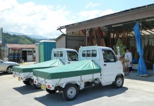 軽トラックを2台リースで入れたので、大原神官さんにお払いしてもらいました。これは塩沢さんと原Tさんの専用車で、通勤から使ってもらいます。塩沢さんはミラに乗っていましたが、現場に行くのはトラックが多く、自分の工具も積んでいた方が便利だし、材料も濡れないシート付きのが良いということになりました。原Tさんはリフォームで使います。これでまた少し効率的になると思います。