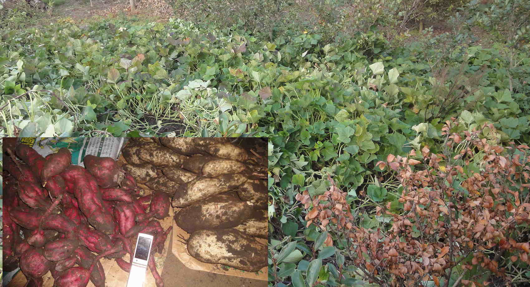裏の畑のさつまいもを収穫しました。今年から畑を始めたお母さんが、たぶん芋乾しの好きな長女のために植えたと思うのですが、普通のサツマイモと乾芋用の2種類あります。芋は2通りの畝(うね)に6、7株づつ植えたものがイモツル式に広範囲に伸びて、これを切って片付けるのにエライ苦労をしました。そして掘ってみると、こんなでかい芋どうやって食うのかと考えてしまうような特大な芋がたくさん採れました。仕舞いには一株掘るごとにハァーハァーと息が荒くなり、思わぬところで体力の衰えを感じてしまいました。それにしてもこの収穫はどうするのでしょうか?