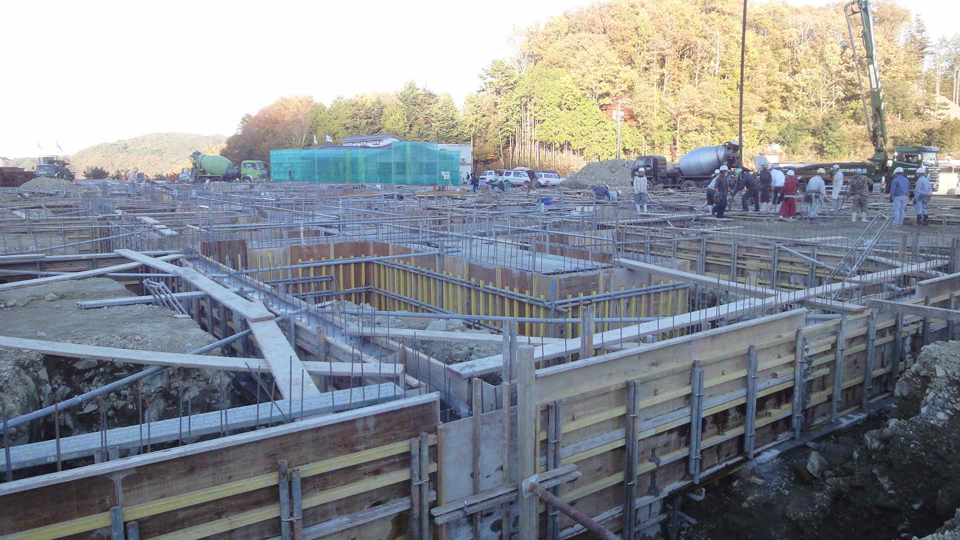 阿南町の小規模特養粟野荘の基礎コンクリートが打てました。なかなか職人さんが集まらず所澤さんがやせる思いをしていましたが、ようやく基礎のコンクリートが打設できて一安心しました。昨日の定例工事会議ではコンクリートが280㎥入るので、打設は朝7時から午後6時までかかるとのことでしたが若干短縮できました。今は凍るほどではないのでまだまだよいのですが、これからのコンクリート打設は大変です。ここでもありますが、特に広い土間は押さえるのに深夜や朝方までかかりますからね。今でさえ事務所の中でも寒い寒いと仕事をしますが外で働く人もいるんです。本当にご苦労様です。