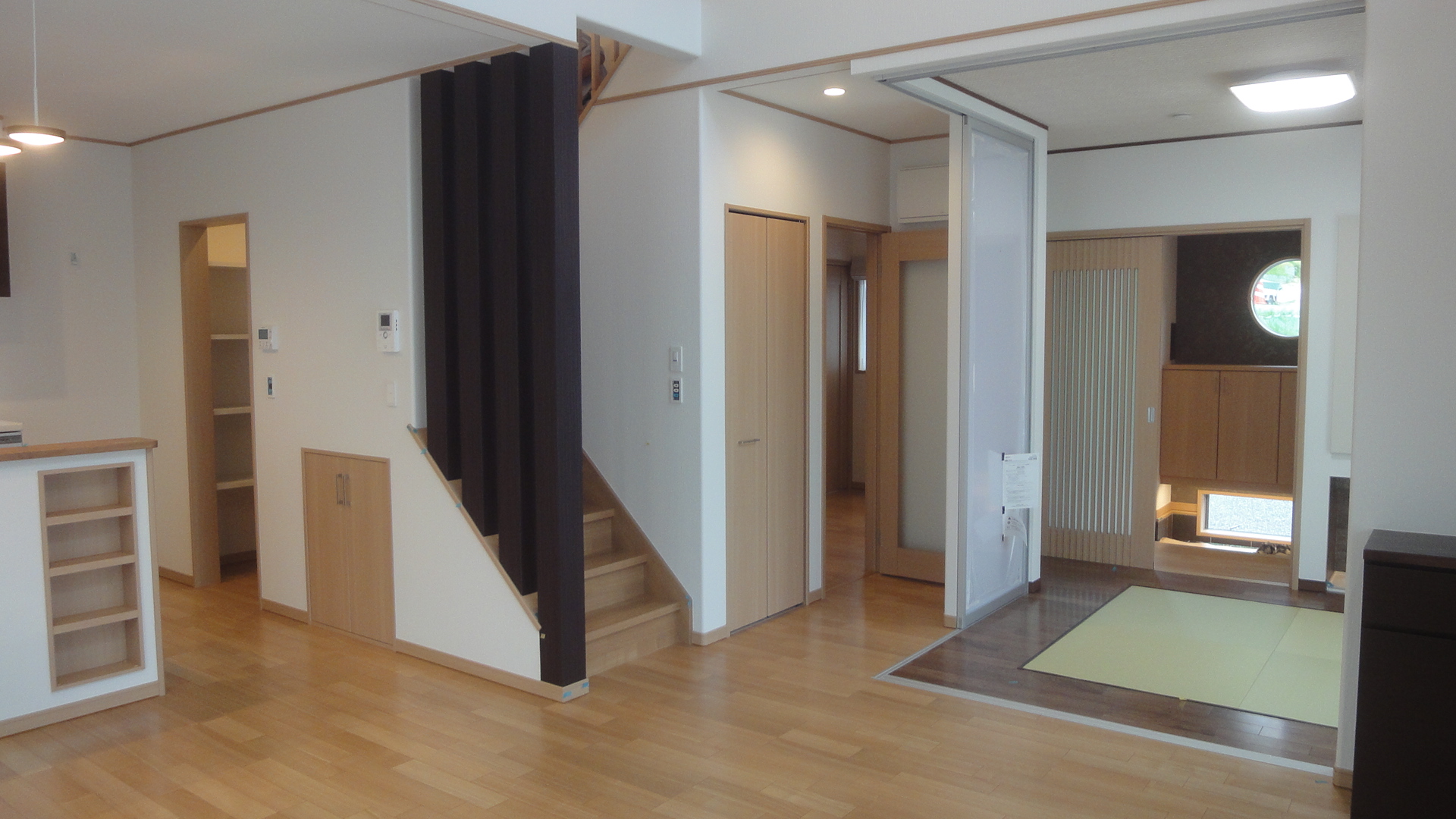 千栄の柏原K邸の社内完成検査を行いました。このお家、丸窓こそあれ、ちょっと四角い外観からは想像できないような開放感いっぱいの造りです。玄関は実用的な引き戸、中はルーバーのスクリーンや、丸窓の下の明り取りの手前には砂利が敷かれて雰囲気を出します。そこから畳のある居間に入ると、天井までのアルミ戸が直角に閉まり、吹き抜けのあるLDKに続きます。水回りへの同線もいいですし、家じゅうにただよう質感も上質ですね。そしてなにより、本当にウグイスが鳴いている自然あふれる