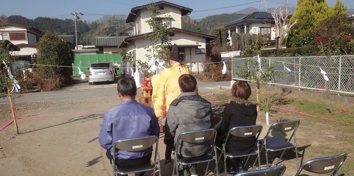 大安の今日は風が少し冷たく感じるなかで、高森町K邸の地鎮祭が行われました。後ろから見ればご夫婦だけですが、小さなお子さんが両膝の上におりこうに鎮座されていましたのでご家族は4名様です。そのお兄さんがお父さんと仮初めの義をおこなってくれました。そ