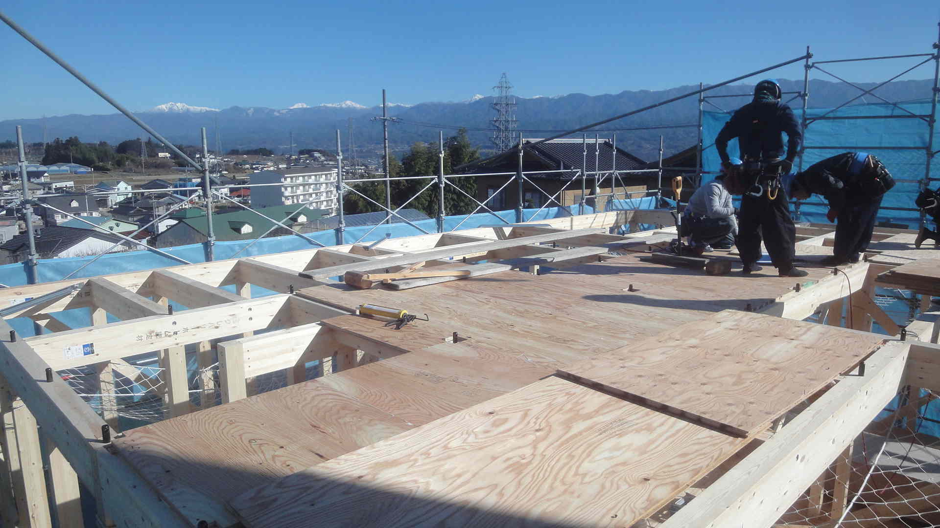 棟できました。実は昨日の大安に予定していたのですが、午後から雨の予報があり、今日は間違いなくできると踏んで塩沢さんが延期を決めました。昨日は、結果的にはやってできないことはありませんでしたが、朝から風も強かったので熊谷棟梁も喜んでくれて、大工さん達も上着を脱いでの作業ができたくらい暖かで良かったです。それでも大工さん8人で完了メールが届いたのは、もう日が沈み5時近くなってからとは、なかなかな?お家ですね。安全な作業をありがとうございました。