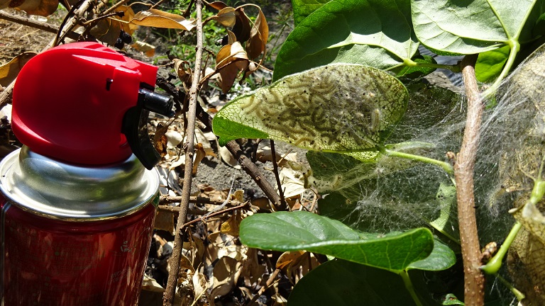 このお盆休みはアメシロ対策で明け暮れました。とは、ちょっと大げさですが、一回退治してもまた翌日には新たに巣を作ってあり、それが毛虫(幼虫)になるのが早いので放っておけなくてかなりの時間と労力を使いました。卵は蜘蛛の巣のような細かい糸の網の中にあり、消毒をしても中まで行き届かないのが難点