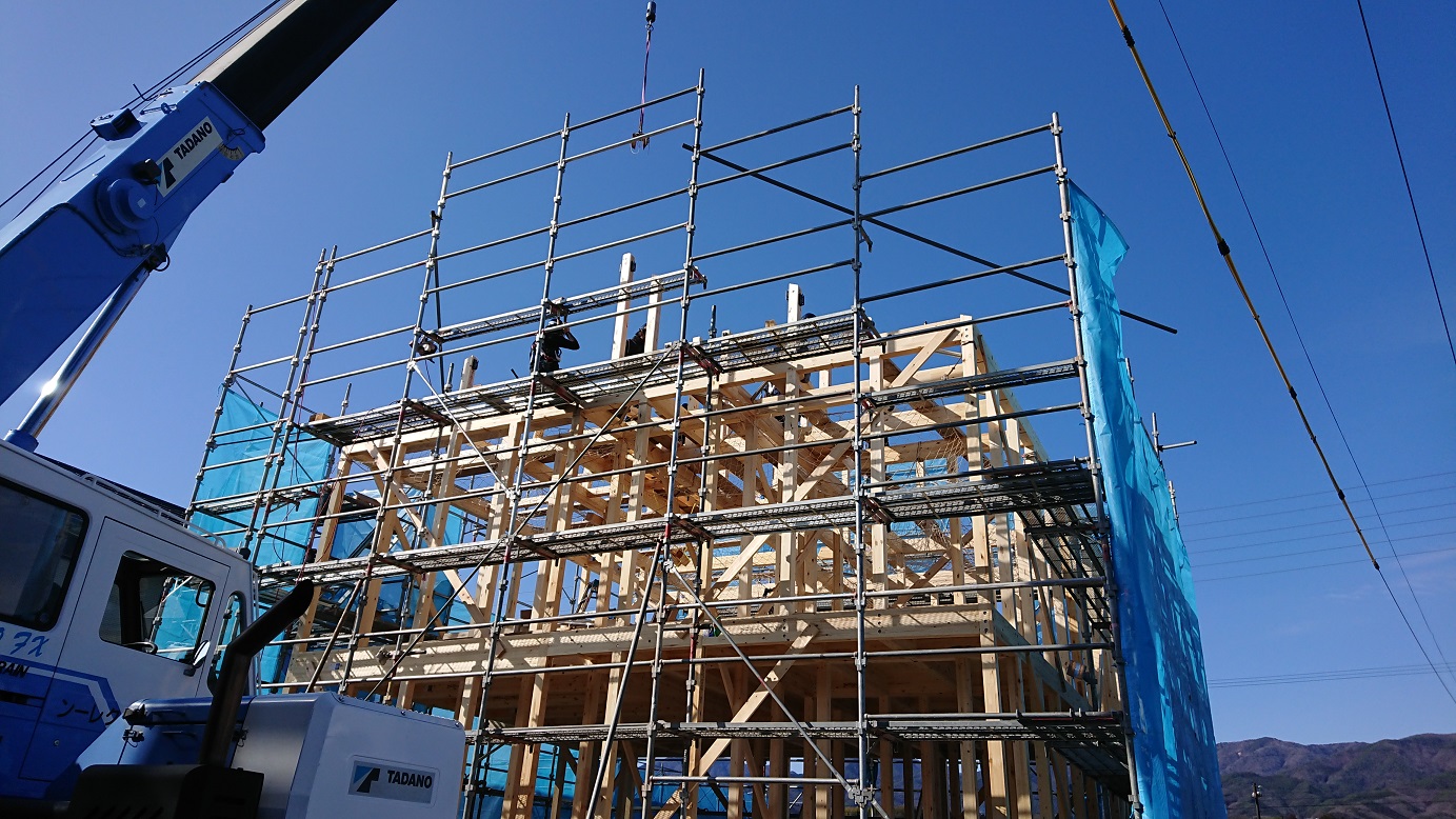 駐車 抜けるような空です。豊丘村のK邸が無事に上棟できました。この時期にしては朝もそんなに寒くなく風もあまりなくての建て方日和で助かりました。ここは役場のすぐ北なので、現場を見に行ったりとか何かの時には広い駐車場に停めれるので有難いです。お隣で建築中のH邸の見学会も予定されています。寄り付きは良いですね。