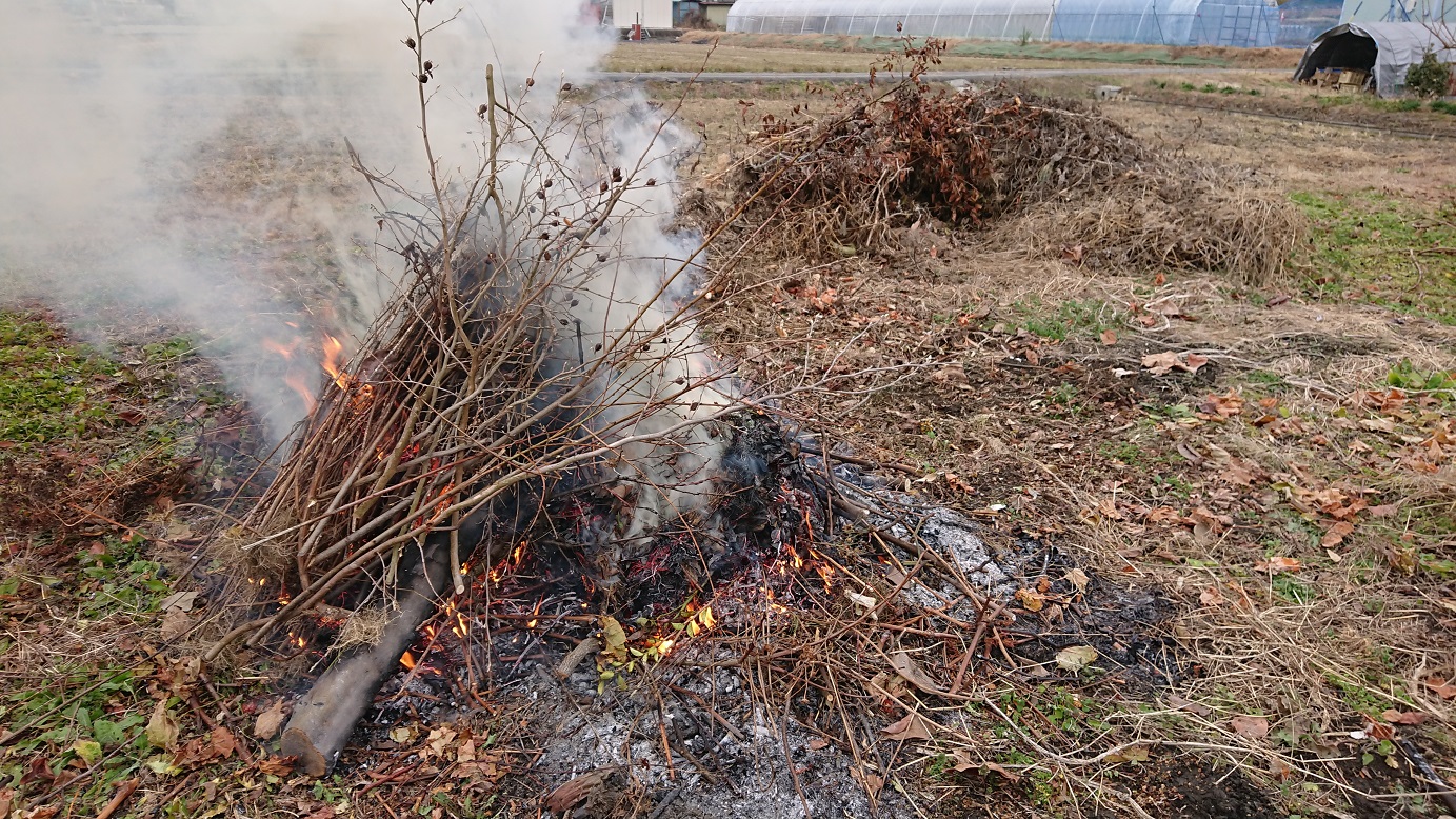 虫 畑の枝を燃やしました。柿やブドウ、イチジク、キウイなどの果樹や山茶花や花桃など畑に植えられている樹木を選定した枝や、母が手入れしていた花の残骸です。例えばブドウの枝にはブドウ虫が入っているかもしれないし、枯れ枝葉には虫や菌が越冬しているかもしれないので殺虫の狙いが大きいです。悩みは毎年の事なんですが、積み重ねた枝葉が腐ってその中にカブトムシの幼虫が結構大きくなっているんです。そういうところではなるべく熱が届かないように焼きます。