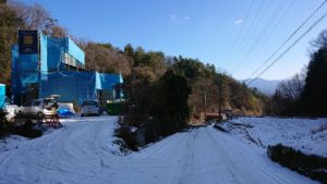 雪国? 伊豆木のO邸の木工事検査を行いました。そこまでは難なく行けたのですが、スイッチバックして現場に入る50m手前で躊躇!4駆なので私の車は大丈夫と思うのですが後から来る車がつかえたりすると面倒なので少し手前から歩きました。やはり西部地区は雪が多いです。複雑な屋根の下、小屋組みが見える居間は明るく独創的で田舎暮らしが楽しそうです。