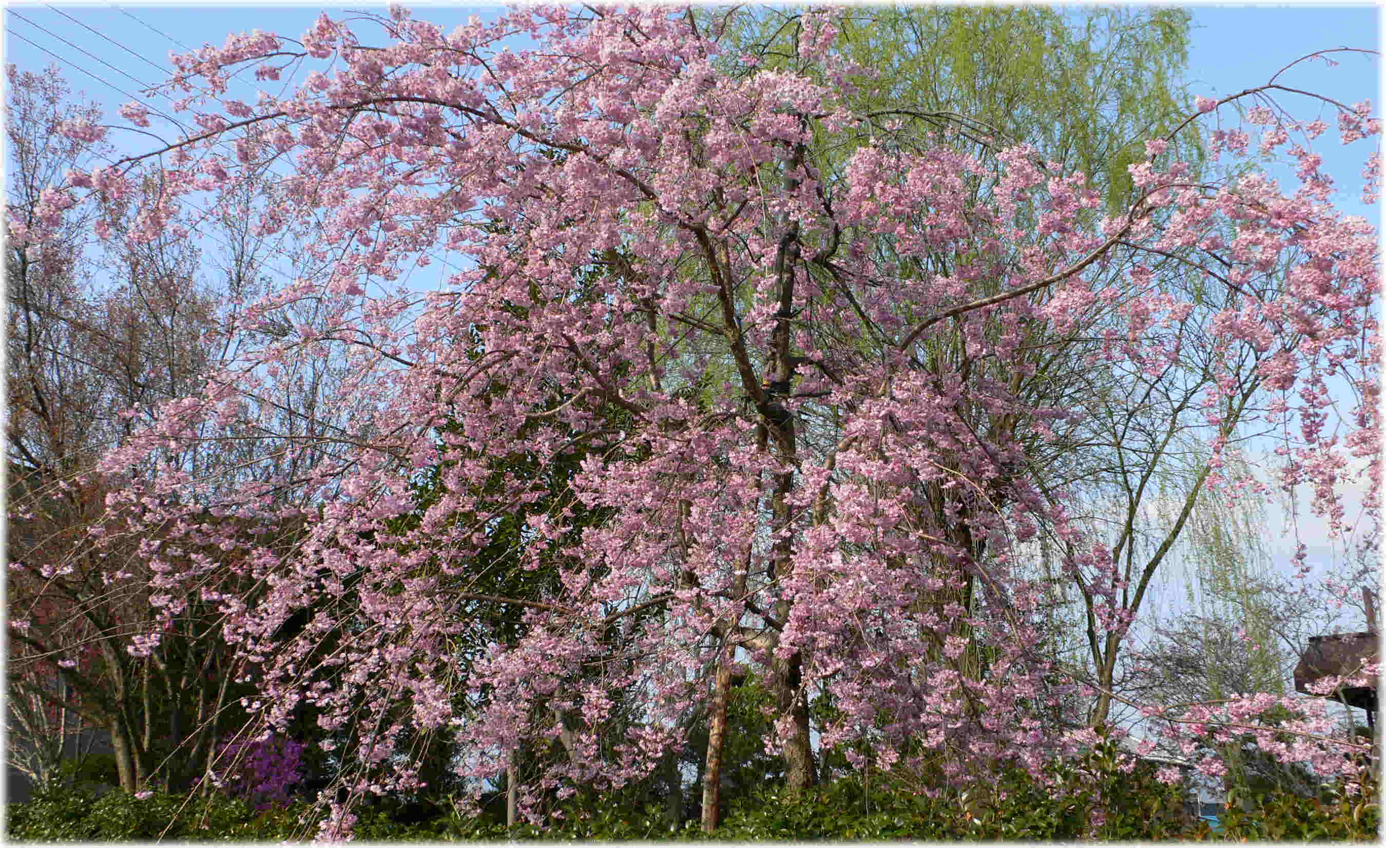 下条村の、会社で所有している竹藪のところの道路へ、木が倒れていて危ない、と数日前にタケノコをとりに行った母が言うので、今日は朝から倒木処理に行きました。行って見ると、確かに雪の重みで倒れたらしい木が道路の反対の竹に寄りかかり、アーチ状になっていました。今のところ通行には支障ないようでしたが、いつ落ちるか分からないので確かに危ないし、迷惑になりそうです。早速、チェーンソーで倒れた木を幾つかに分断して取り除きました。途中、チェーンソーの歯が木に食い込んだりして弛んで外れてしまいましたので、かなりの部分を手ノコとナタでやることになってしまい苦労しました。倒れそうなものを含めて数本の木や竹を切り倒しました。その後、本社でビーバーで草刈りを(三石部長も来てくれました)したり、カラスノエンドウ類のつる草をムシったりと、久しぶりに腕を振るいました。明後日?は筋肉痛です。尚、写真はあんまりきれいなお隣のお庭です。
