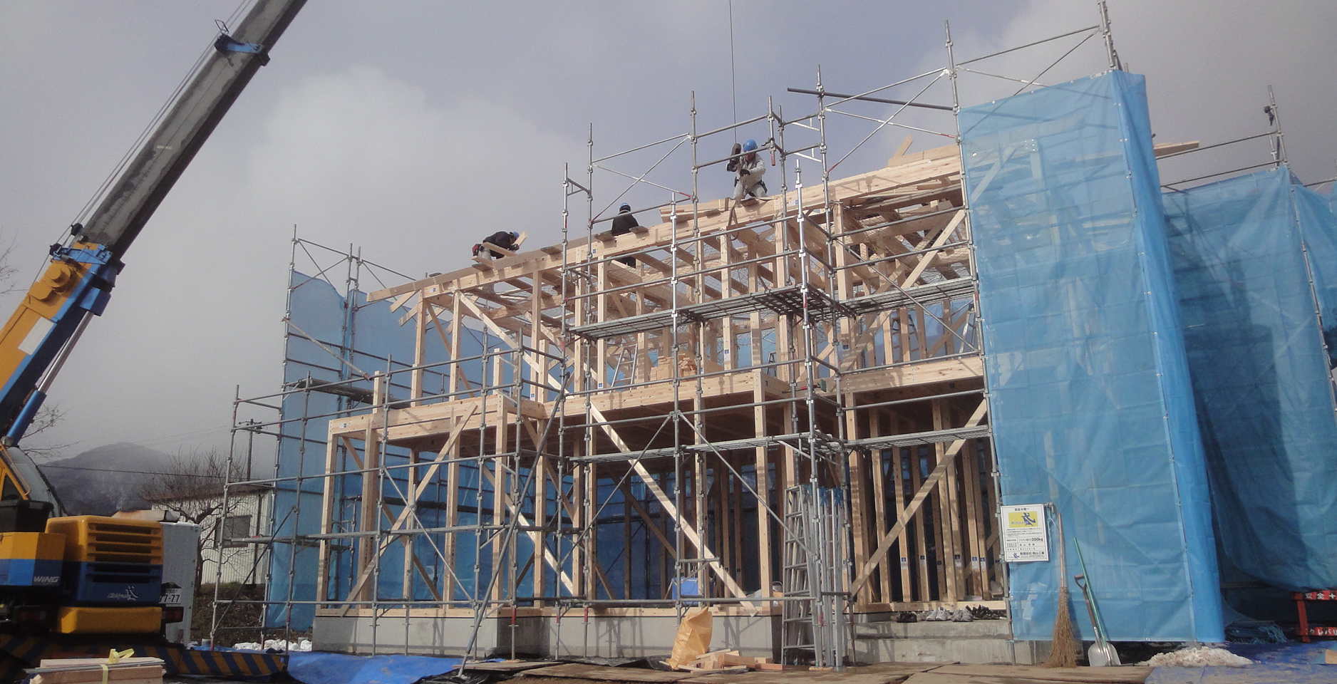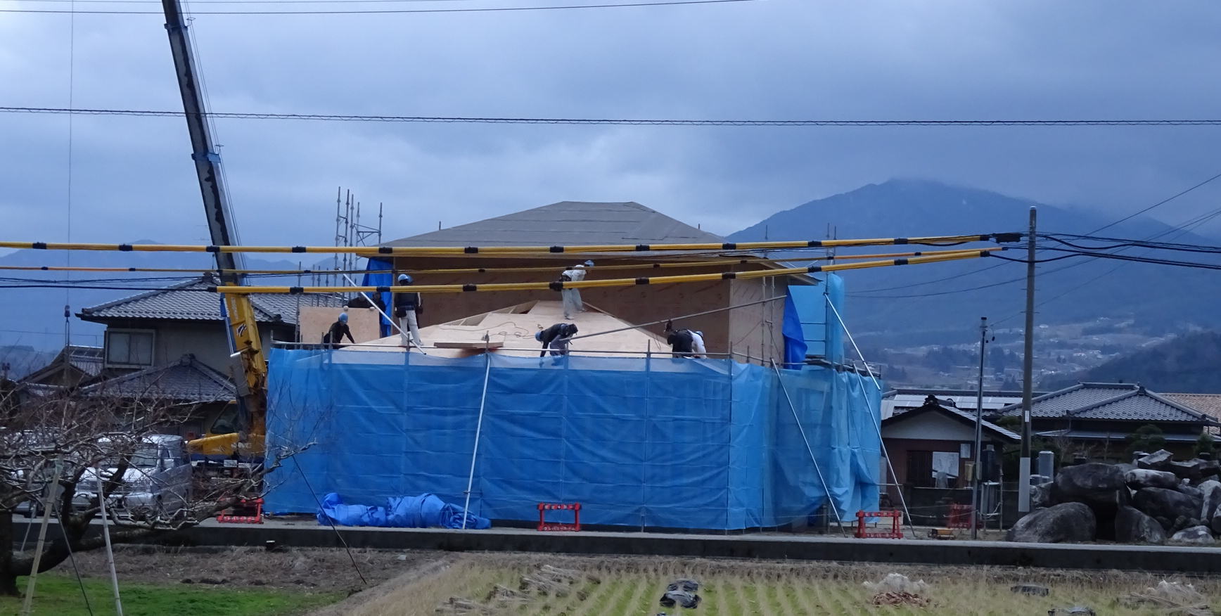 豊丘村神稲のM邸が上棟できました。でも残念ながら下屋部分がまとまりきらなかったのは予想外の寒さのせいばかりではなく、下屋部分が3カ所あり2階の外壁ほぼ3面に耐力合板を先張りしたのが手間がかかった理由です。それから途中で、飯伊木造建築安全推進協議会の安全パトロールの立ち入り調査があったことも若干影響したようです。飯田下伊那を4つくらいのブロックに分けて木造建築に関係する団体の役員さんが回るのですが、この地区には労基署の署長さんも来られたとのこと、緊張しますね。ちょうど2階の梁を組んで墜落防止のネットを張っている時だったらしく、何も指摘がなくて何よりでした。明日も作業は少し残りますがよろしくお願いします。