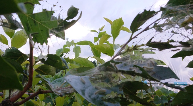 時期 アメシロが発生していました。ブドウの近くの柿の木ですが、気が付きませんでした。アメシロは木の葉っぱ数枚をクモの巣のように囲ってその中に卵を産みます。卵が幼虫になり葉っぱを食べて枯らすので気が付くのですが、その時は既に毛虫が育ってウジャウジャしているのです。裏の畑のなんじゃもんじゃの木にも着いていました。どうせ柿も消毒しなければならない頃だし、日曜日の朝は動噴で消毒です。