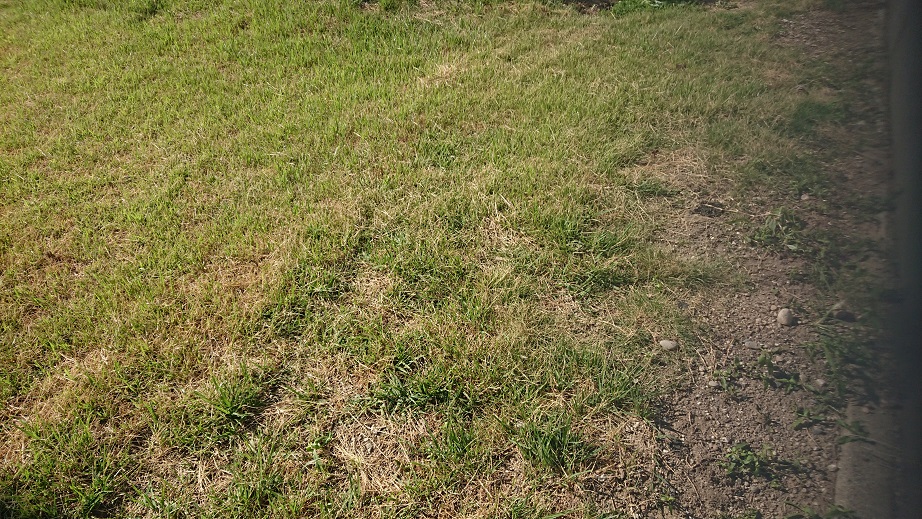 草 なんのことはない会社の芝なんですが、昨日の朝、除草剤を撒きました。お盆のうちに芝刈りをしたのですが、油断してたらけっこう雑草が生えていたからです。こう暑くて雨が降らない日が続いているので、草(芝)刈りは朝露があるうちでないと茎が固くなり刈りにくくなります。刈った日も、会社に来たときは芝が青々としていたのですが、借り始めたら葉っぱが乾き、私の頭のように地が透けるように縮んで上手く刈れませんでした。乾いていても草はどんどん伸びるんです。