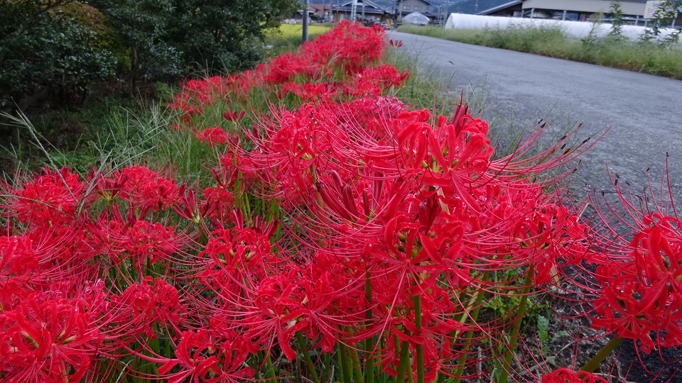家の裏の道の土手の彼岸花がようやく満開に咲きました。ここは他より遅くて10日前の彼岸の入りには芽も出ていませんでしたので枯れちゃったかなと心配したほどです。と言うのも、母がこの曼殊沙華をけっこう大事にしていて、私がこの土手の草刈りを年に3、4回するのですが、夏の雑草が伸びたところのいい時期に草刈りをしろと指示があり、ちょうど一月前の8月末に刈ったのです。それから気になって様子を見ていましたが他のところでは花が咲いているのになかなか芽が出てこなかったのです。草刈りの時には、この球根が土手からぼろぼろとこぼれ落ちる